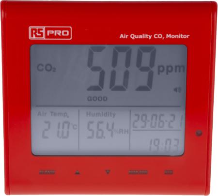 RS PRO DT-802 Air Quality Monitor for CO2, Humidity, Temperature, +50°C Max, 90%RH Max, Mains-Powered