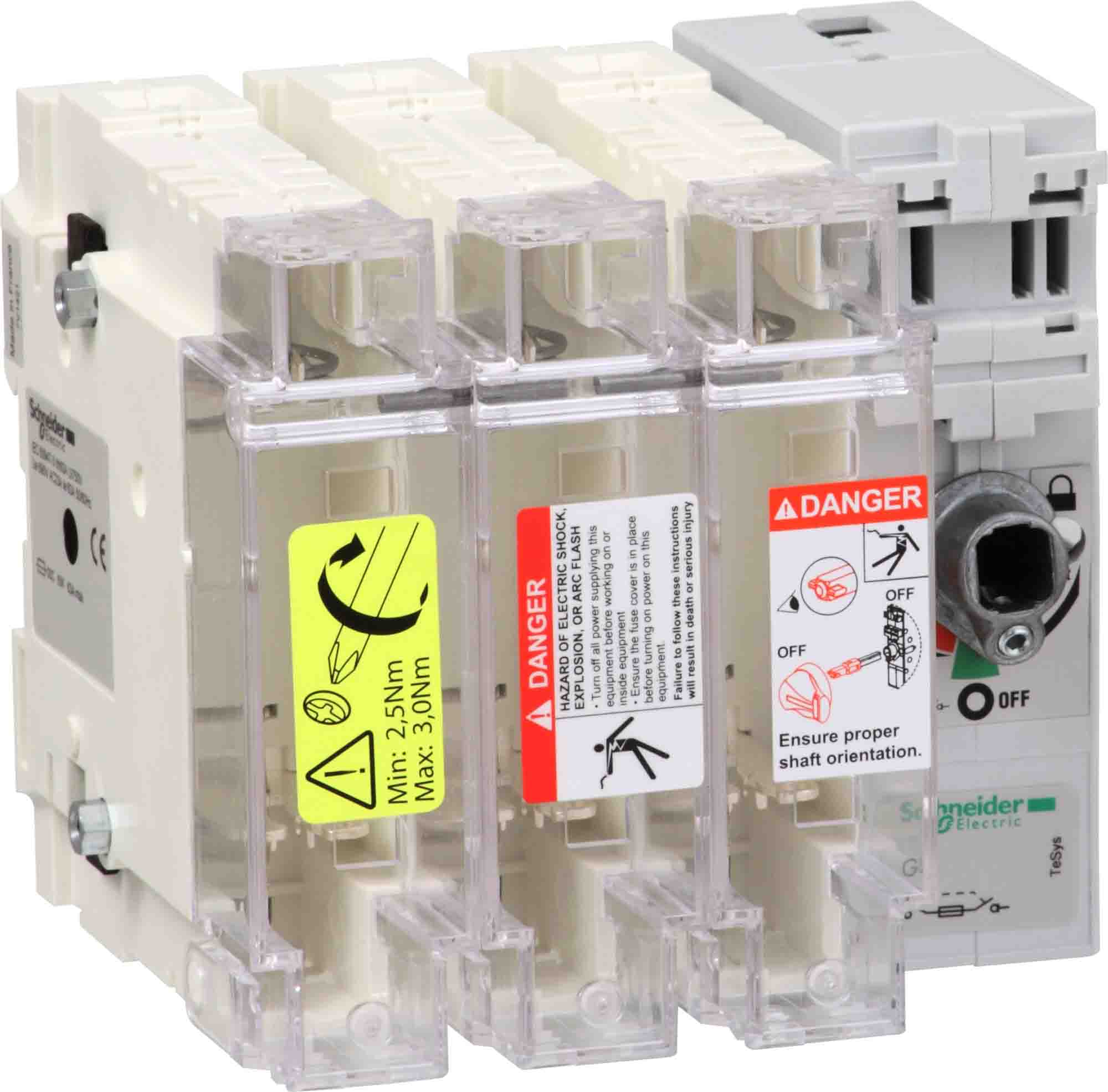 The Schneider Electric TeSys GS - switch-disconnector-fuse, NFC Fuse type. Type of operating handle External right side/External frontal. Not Suitable For Ground Mounting. Connections - terminals Power circuit: bars20 mm², Power circuit: lugs-ring terminals25…95 mm². With Plate Mounting support. Mechanical durability-10000 cyclesElectrical durability-1500 CyclesSustainable