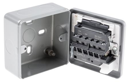MK Electric Switched Fused Spur The MK Electric 1-gang switched fused spur with flex outlet has a current rating of 13A. This 2-pole switch has an outer casing manufactured from tough mild steel with a scratch-resistant paint finish. There is a 3-pin operated safety shutter on the socket. This durable wiring accessory designed for use in rough environments. It has a length of 86mm, a width of 86mm and depth of 47mm. Features and Benefits Easy to installSurface mountNeutral contact makes first and breaks last for added safetyMinimum 3mm contact gap for safety switch isolationFuse carrier can be padlocked in an open position for safe maintenanceEarth terminal fitted in base of box Applications GaragesTool shedsFactoriesWorkshopsWarehouses Certifications ANSI/ESD S20.20:2014BS EN 61340-5-1:2007