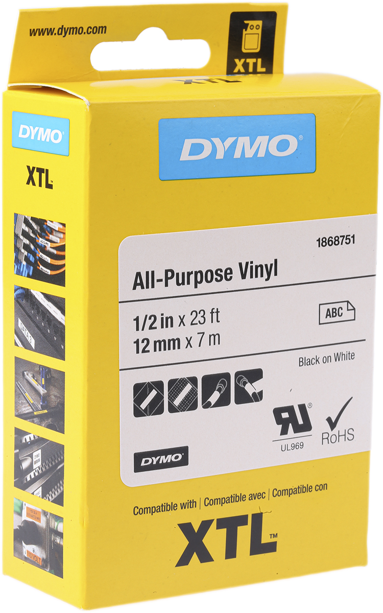 DYMO XTL All-Purpose Vinyl Labels From textured surfaces to cables, vinyl labels are ideal for almost any labeling application. Vinyl offers moisture, chemical and UV resistance, making it ideal for labeling both indoors and outdoors. Available in sizes from 12 mm to 54 mm (1/2in. to 2in.) and in a wide range of colours From textured surfaces to cables, vinyl labels are ideal for almost any labeling applicationVinyl offers moisture, chemical and UV resistance, making it ideal for labeling both indoors and outdoorsAvailable in a wide range of colours that fit with OSHA, ANSI, and ISO colour standards to enhance workplace communication and safetyRoHS compliantEasy-to-peel split back design makes applying labels quick and easyDurable thermal transfer printing technology – label text wont smear or fadeLabels comply with ANSI/TIA 606-B standards DELIVERING VERSATILITY AND DURABILITY, NO MATTER WHAT THE TASK DYMO XTL™ labels are durable and made for a variety of surfaces. Whether you are labelling to OSHA, ISO and ANSI colour standards or labelling in harsh conditions, DYMO XTL labels have you covered. Jobsite-tested and UL-recognised, these labels wont smear or fade.Compatible with DYMO XTL label makers ONE LABEL SYSTEM. COUNTLESS APPLICATIONS Industrial-strength labels withstand the toughest conditions - moisture, chemicals, a wide range of temperatures, UV light and moreDurable thermal transfer printing technology - label text wont smear or fadeEasy-to-peel split back design and pre-sized labels make applying labels quick and easy Compatibility All DYMO XTL™ label makers