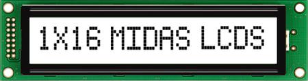 Midas MC11615A6W-FPTLW-V2 Alphanumeric LCD Display, Black on White, 1 Row by 16 Characters, Transflective