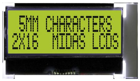 Midas MCCOG21605D6W-SPTLYI Alphanumeric LCD Display Yellow-Green, 2 Rows by 16 Characters, Transflective