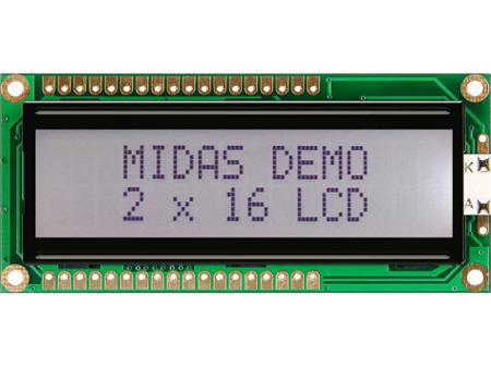 Midas MC21605G6W-FPTLW3.3-V2 Alphanumeric LCD Display, 2 Rows by 16 Characters