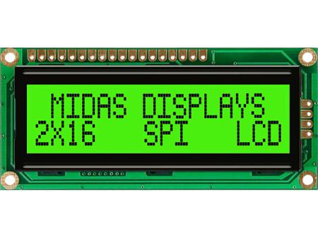 Midas MD21605G6W1-FPTLRGBS Alphanumeric LCD Display, 2 Rows by 16 Characters