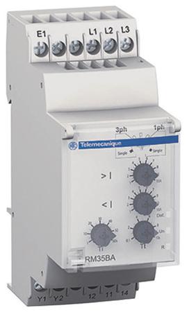 RM35 BA control relay Schneider Electric RM35 BA10 measurement and control relay monitors single phase and 3 phase pumps. It controls the sequence of phases L1, L2 and L3, the loss of one or more phases, and under and overcurrent. Checks its own power supplyClear hinged front coverLED display of output statusDIN Rail mounting