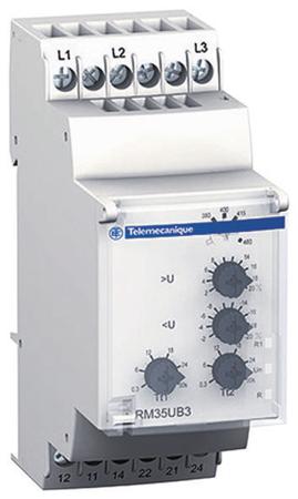 RM17 UB3 and RM35 UB3 Three-Phase Voltage Control Relay Schneider Electric RM17/35 UB measurement and control relays for 3 phase supplies, monitor correct sequences of phases L1, L2 and L3. It also monitors total loss of one or more phases, asymmetry, and over and undervoltage with independent adjustments. In the event of voltage fault, the relay opens at the end of the time delay set by the user, if the device is switched on with a measured fault, the relay remains open. Checks its own power supplyClear hinged front coverPotentiometer selects voltages between phasesLED display of output statusDIN Rail mounting