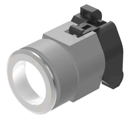 The EAO indicator actuator has a mounting cut out of 30.5mm and circular front dimension of 35mm. It conforms to IP 65 protection degree. The actuator has a colourless plastic lens that employs marking plate illumination. It has an aluminium front ring with a natural anodised colour and a black plastic housing. The indicator has a screw terminal connection method. Function: Indicator
