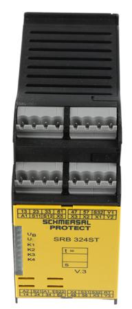 PROTECT SRB324ST - Safety Relay Suitable for signal processing of potential-free outputs, e.g. emergency stop command devices, position switches and solenoid interlocks Suitable for signal processing of outputs connected to potentials (AOPDs), e.g. safety light grids/curtains 3 safety contacts, STOP 0, 2 safety contacts, STOP 1 (adjustable 1 → 30 s) 4 Signalling outputs Optional: Short-circuit recognition, Manual reset with edge detection in fail-safe circuit, Automatic reset function Approvals BG, USA/CAN