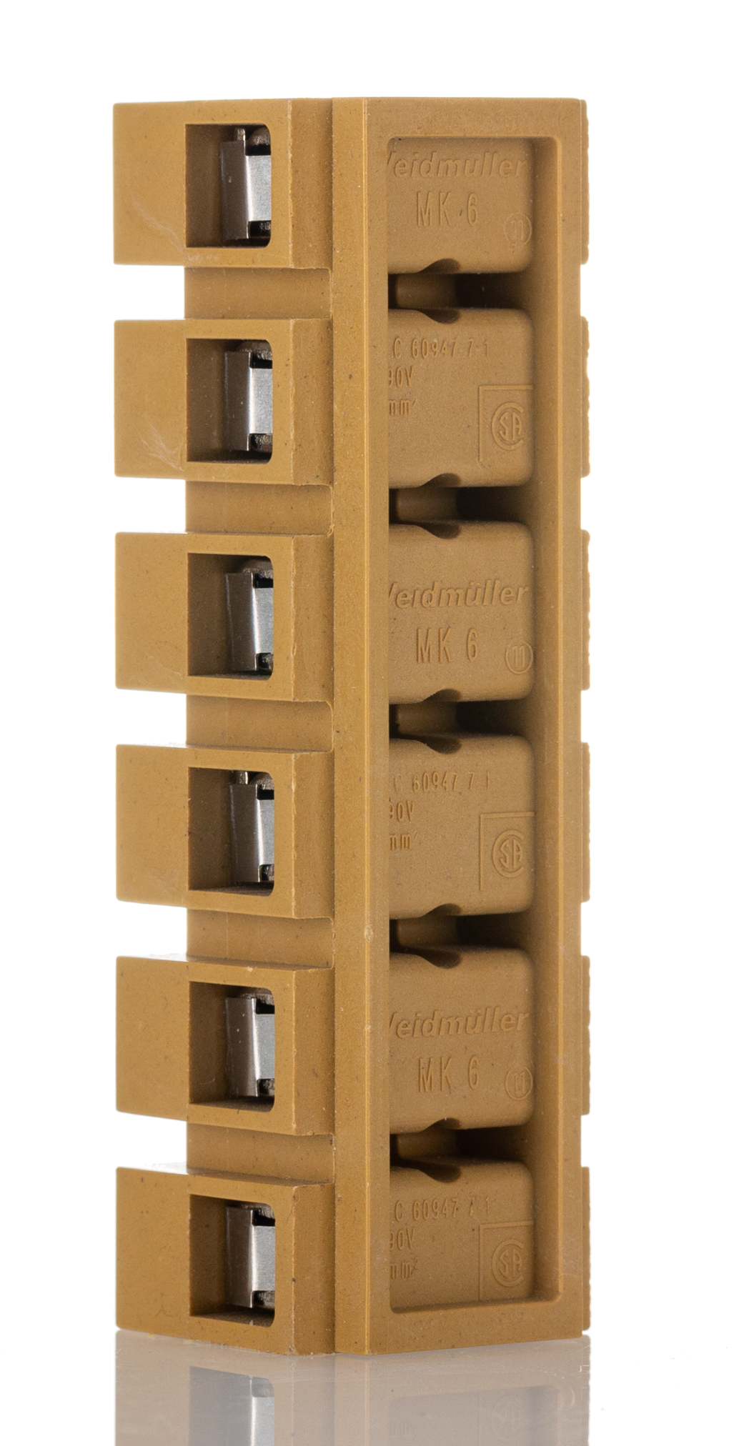 Weidmüller Terminal Strip, 41A Current Rating, 690V Voltage Rating - 0620120000 This terminal strip by Weidmüller is designed for high current applications with a current rating of 41A. The strip is coloured yellow and made from KrG material, ensuring reliable performance in various environments. With a voltage rating of 690V, this terminal strip is ideal for electrical and mechanical industries. Features & Benefits • Straight body orientation for easy installation• Dimensions of 22 x 23 x 75.5 mm provide compact design• Temperature range from -60 °C to +130 °C for versatile usage• M4 screw size for secure connections• Wire size compatibility from 22 to 10 AWG for flexibility in applications Applications • Ideal for power distribution in automation systems• Suitable for electrical panel wiring• Used for connecting high current devices in industrial settings• Can be used for control cabinet installations• Compatible with various wire sizes for different applications Can it operate at extreme temperatures? Yes, this terminal strip can operate in temperatures ranging from -60 °C to +130 °C. Will it fit standard wire sizes? It is compatible with wire sizes from 22 to 10 AWG. Is it suitable for industrial applications? Yes, this product is designed for use in industrial settings.