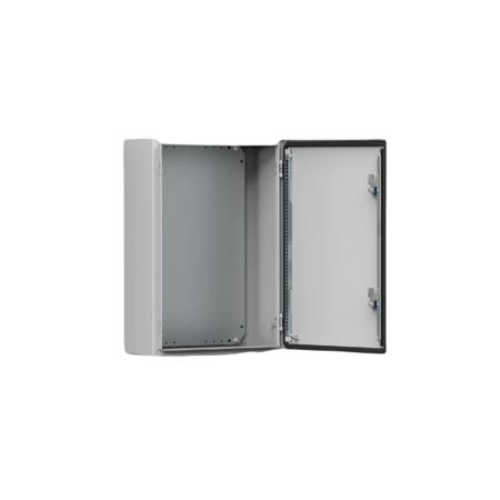 The nVent Hoffman mild steel single door wall mounted enclosure, with a IP66 protection degree, is available off the shelf in many different sizes. This enclosure is well suited for many different applications. The risk for component failure, and with that unnecessary downtime, is eliminated as water and dust are prevented from entering the enclosure. Folded and seam weldedCustomized lock with double bit for easy opening of the doorGland plate opening situated at the far rear of the enclosure, to make cabling onto the mounting plate easierComplies with IP66 , TYPE 4, 12, IK 10RAL 7035 structured powder coating